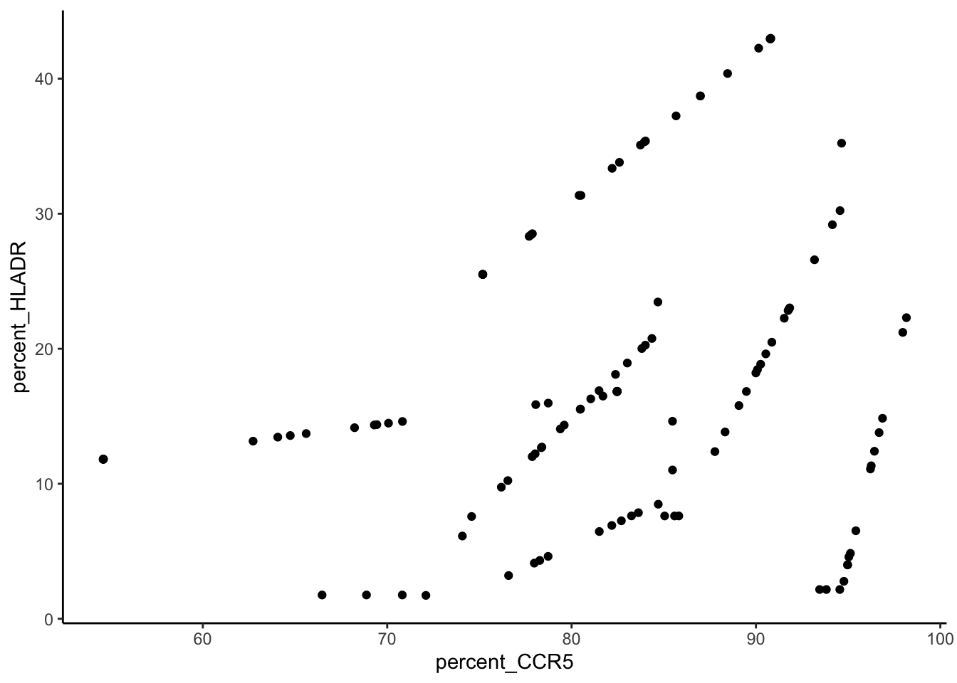 Using this example we’ll look at how the percentage of CCR5 and HLA-DR are correlated in this dataset.