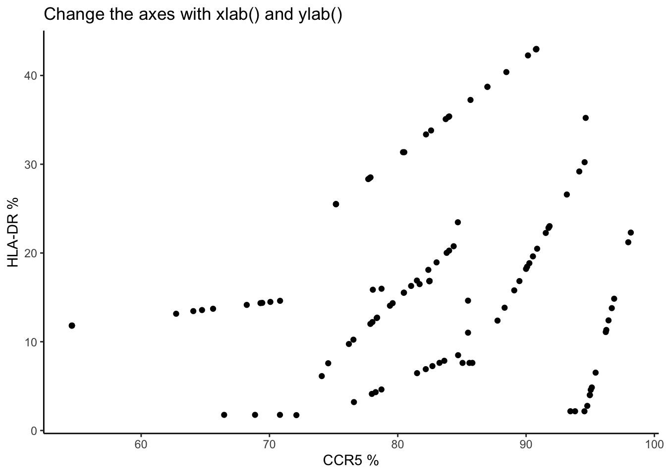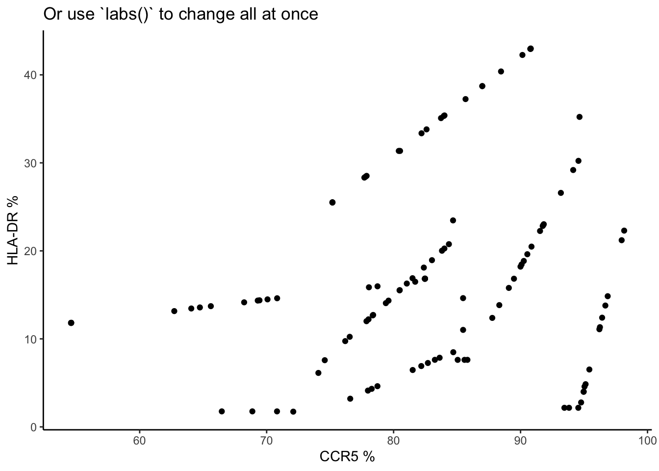 labs(title = "Or use `labs()` to change all at once", x= "CCR5 %", y= "HLA-DR %")