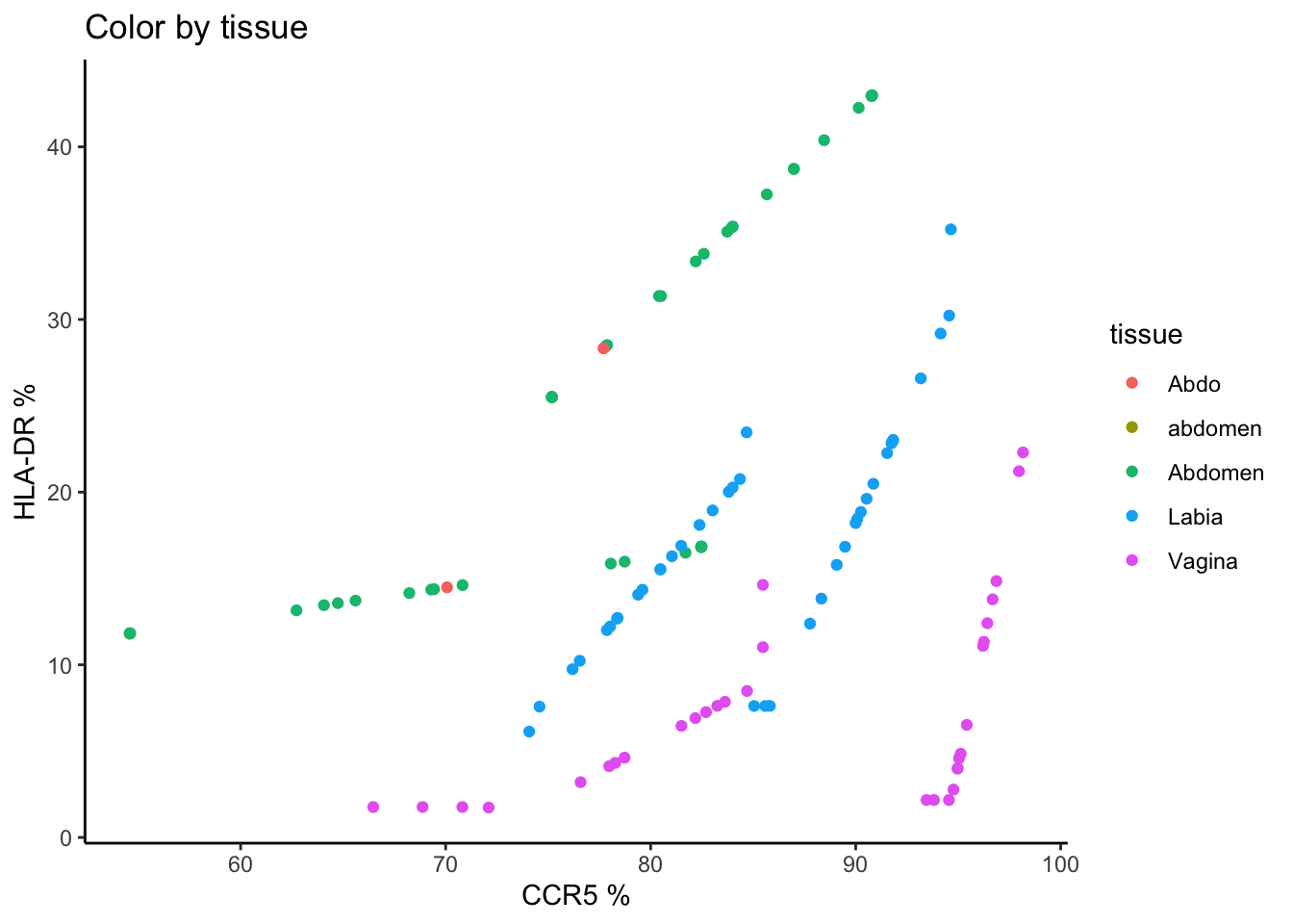 labs(title = "Color by tissue", x= "CCR5 %", y= "HLA-DR %")+