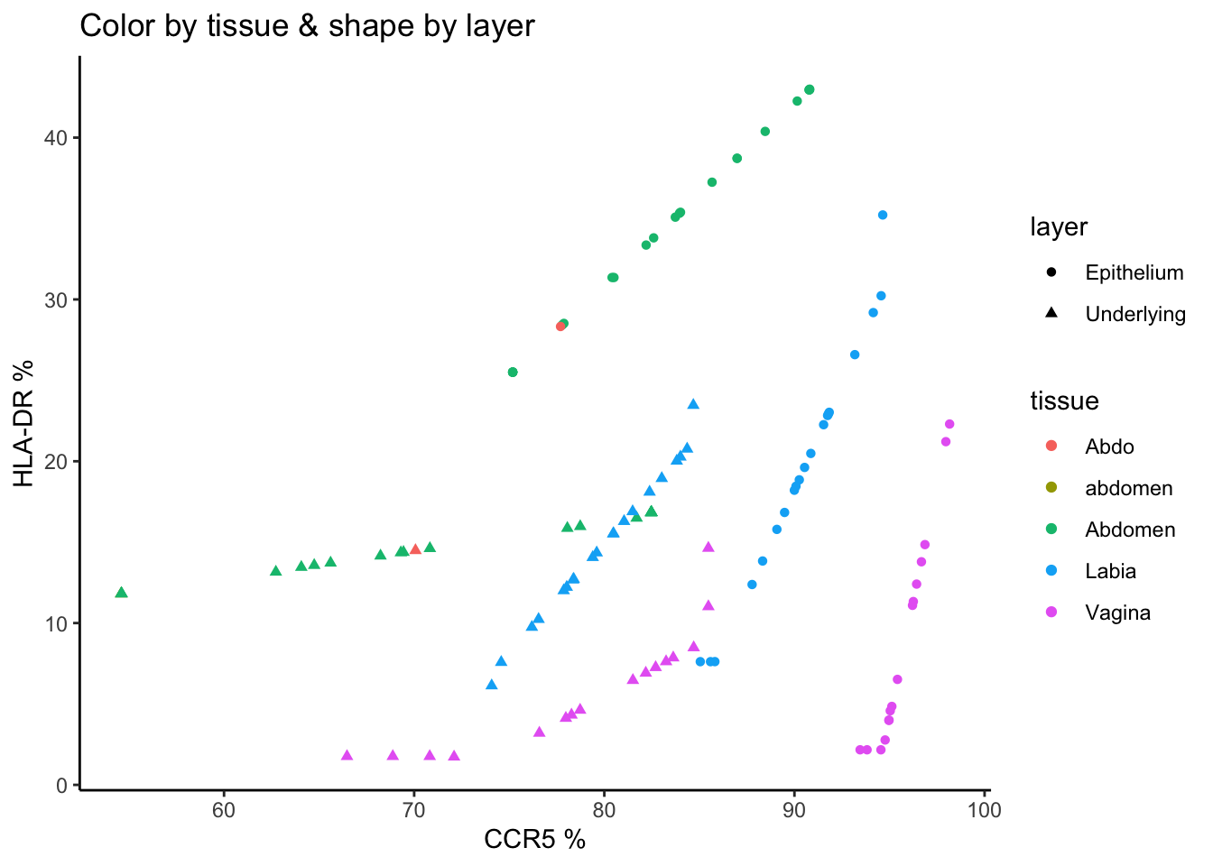 labs(title = "Color by tissue & shape by layer", x= "CCR5 %", y= "HLA-DR %")+