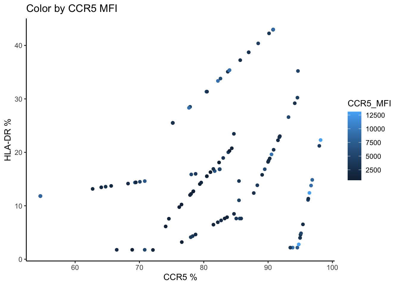 labs(title = "Color by CCR5 MFI", x= "CCR5 %", y= "HLA-DR %")+