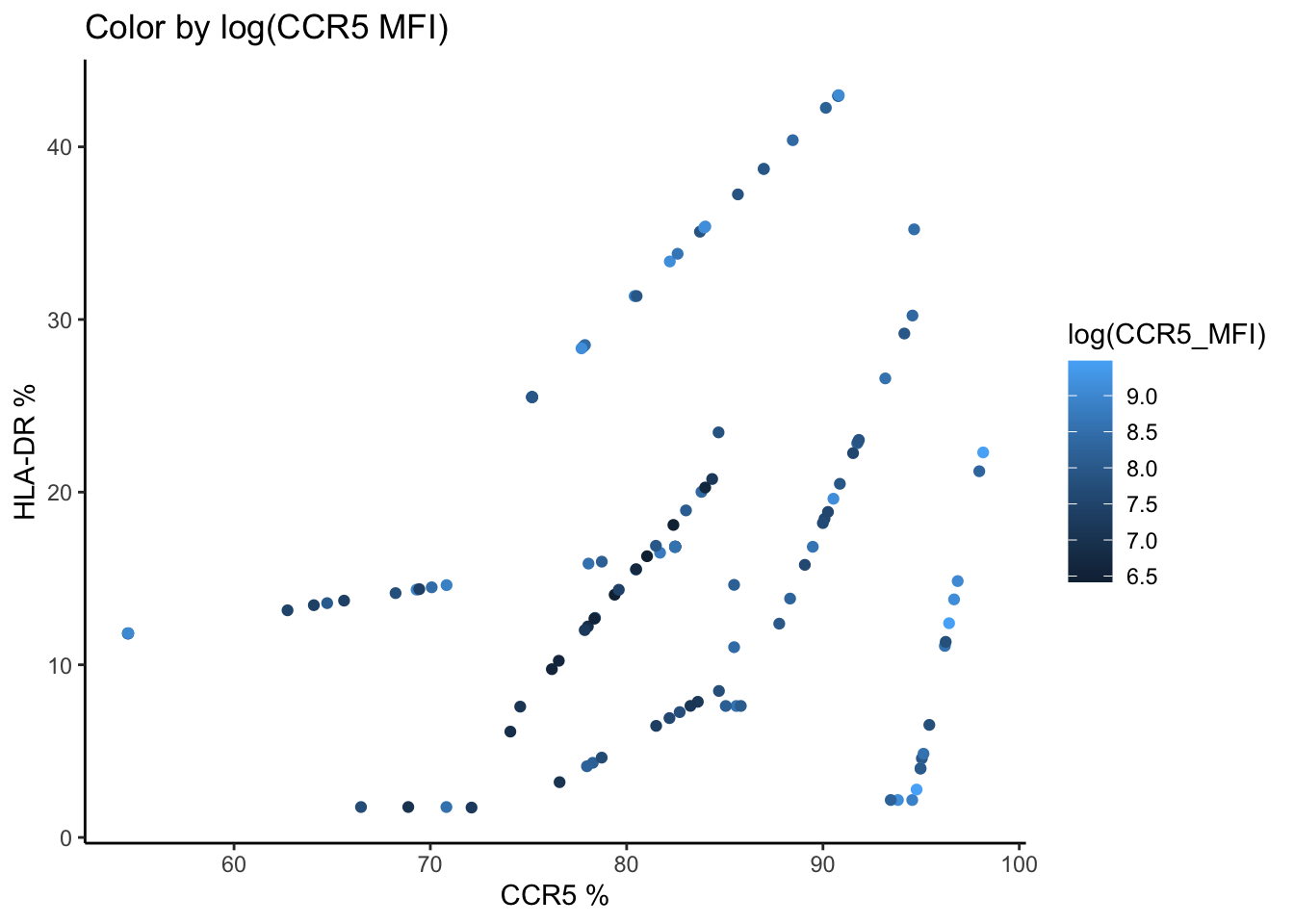 labs(title = "Color by log(CCR5 MFI)", x= "CCR5 %", y= "HLA-DR %")+