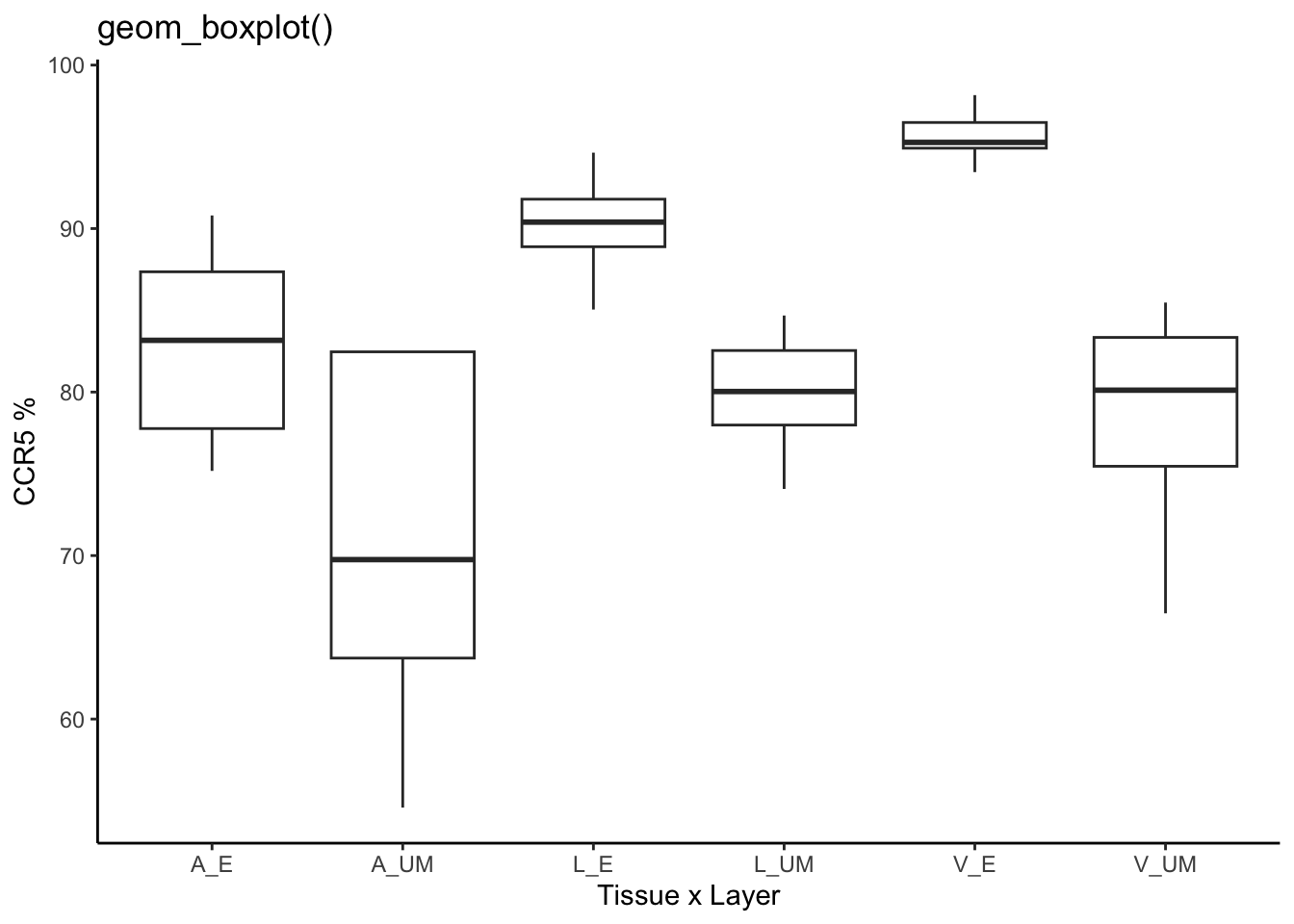 labs(title = "geom_boxplot()", y= "CCR5 %", x= "Tissue x Layer")+