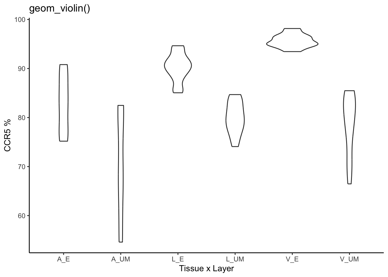 labs(title = "geom_violin()", y= "CCR5 %", x= "Tissue x Layer")+