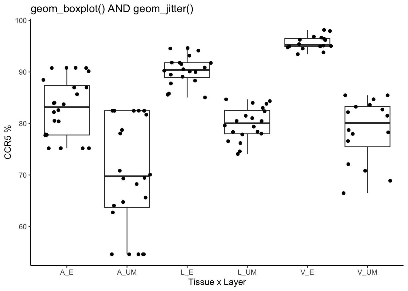 labs(title = "geom_boxplot() AND geom_jitter()", y= "CCR5 %", x= "Tissue x Layer")+