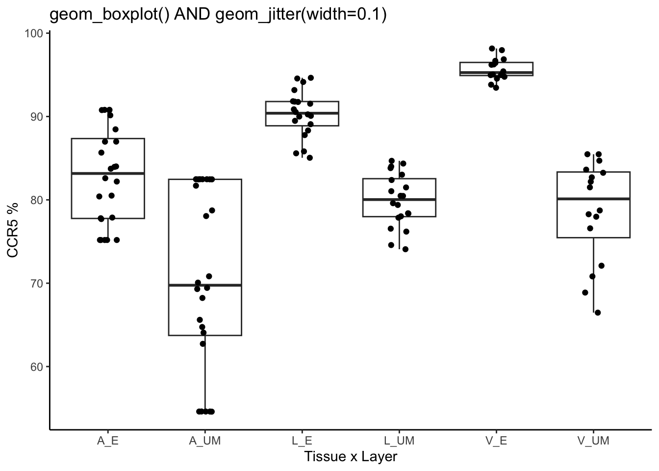 labs(title = "geom_boxplot() AND geom_jitter(width=0.1)", y= "CCR5 %", x= "Tissue x Layer")+