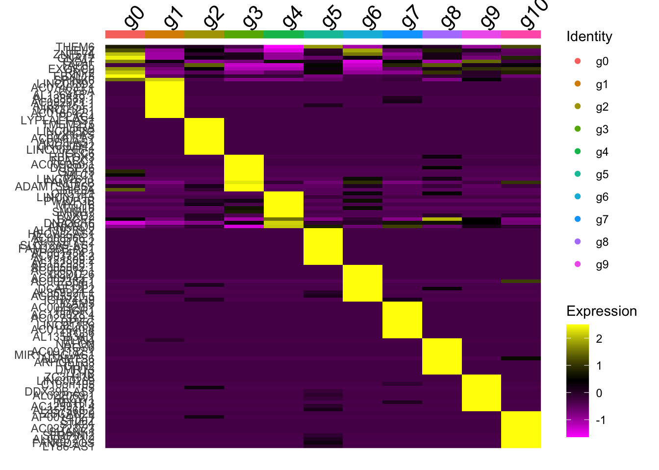 top_n(wt=avg_log2FC, n=10)DoHeatmap(AggregateExpression(ScaleData(data, rownames(data), verbose=F), return.seurat = T, verbose=F),
